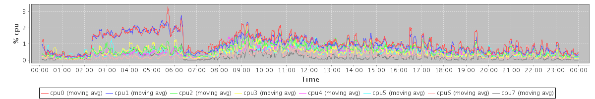 avg(cpu0) = 1.06 avg(cpu1) = 0.97 avg(cpu2) = 0.63 avg(cpu3) = 0.51 avg(cpu4) = 0.51 avg(cpu5) = 0.50 avg(cpu6) = 0.28 avg(cpu7) = 0.24