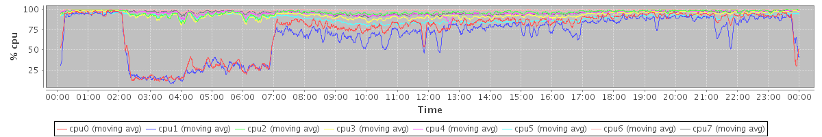 avg(cpu0) = 15.60 avg(cpu1) = 18.97 avg(cpu2) = 0.80 avg(cpu3) = 1.04 avg(cpu4) = 0.52 avg(cpu5) = 0.49 avg(cpu6) = 0.14 avg(cpu7) = 0.25