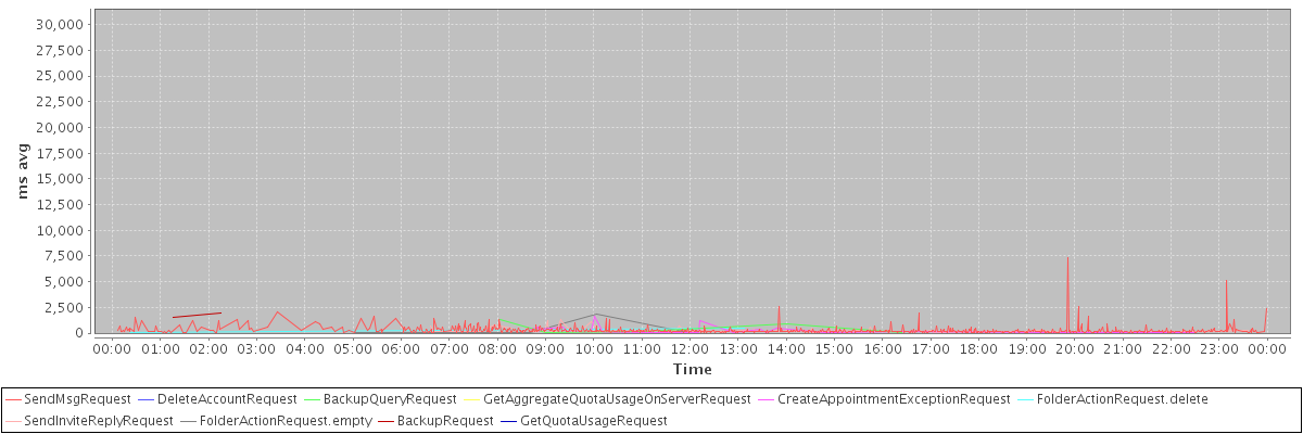 avg(SendMsgRequest) = 258.16 avg(DeleteAccountRequest) = 30040.00 avg(BackupQueryRequest) = 491.40 avg(GetAggregateQuotaUsageOnServerRequest) = 936.00 avg(CreateAppointmentExceptionRequest) = 250.48 avg(FolderActionRequest.delete) = 265.00 avg(SendInviteReplyRequest) = 248.92 avg(FolderActionRequest.empty) = 399.17 avg(BackupRequest) = 1728.50 avg(GetQuotaUsageRequest) = 1053.00