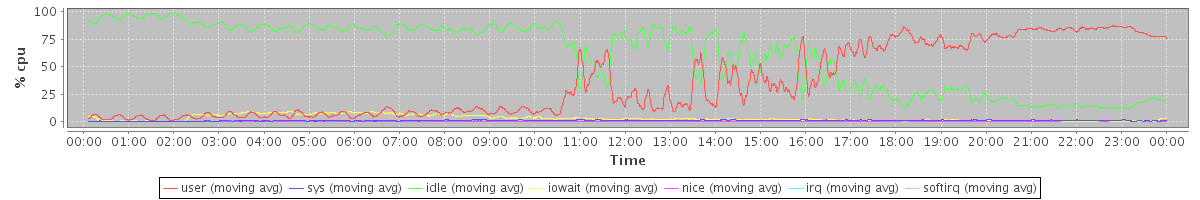 avg(user) = 35.13 avg(sys) = 0.88 avg(idle) = 60.77 avg(iowait) = 3.11 avg(nice) = 0.00 avg(irq) = 0.00 avg(softirq) = 0.12