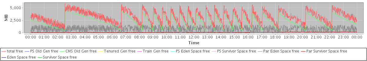 avg(total free) = 3218.20 avg(PS Old Gen free) = 0.00 avg(CMS Old Gen free) = 2326.98 avg(Tenured Gen free) = 0.00 avg(Train Gen free) = 0.00 avg(PS Eden Space free) = 0.00 avg(PS Survivor Space free) = 0.00 avg(Par Eden Space free) = 815.31 avg(Par Survivor Space free) = 75.91 avg(Eden Space free) = 0.00 avg(Survivor Space free) = 0.00