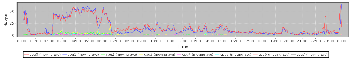 avg(cpu0) = 1.01 avg(cpu1) = 0.84 avg(cpu2) = 0.61 avg(cpu3) = 0.45 avg(cpu4) = 0.50 avg(cpu5) = 0.41 avg(cpu6) = 0.32 avg(cpu7) = 0.19