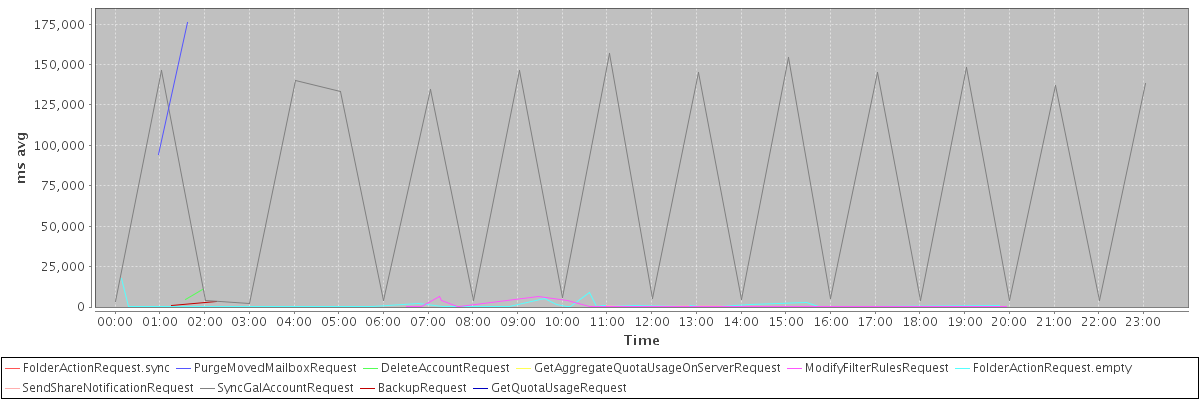 avg(FolderActionRequest.sync) = 6936.00 avg(PurgeMovedMailboxRequest) = 135220.00 avg(DeleteAccountRequest) = 7946.50 avg(GetAggregateQuotaUsageOnServerRequest) = 1169.00 avg(ModifyFilterRulesRequest) = 1155.39 avg(FolderActionRequest.empty) = 1814.19 avg(SendShareNotificationRequest) = 651.00 avg(SyncGalAccountRequest) = 73990.21 avg(BackupRequest) = 2330.00 avg(GetQuotaUsageRequest) = 1337.00