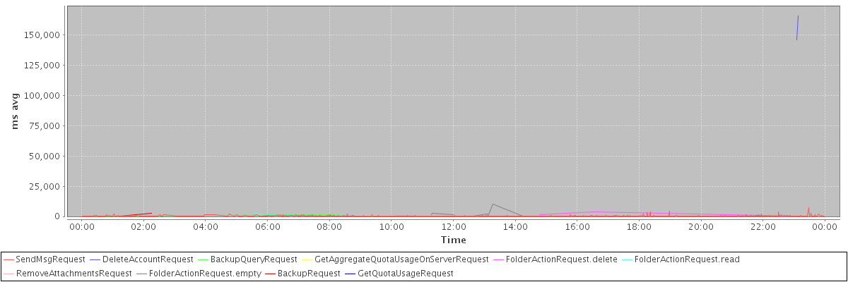 avg(SendMsgRequest) = 335.29 avg(DeleteAccountRequest) = 155881.50 avg(BackupQueryRequest) = 641.40 avg(GetAggregateQuotaUsageOnServerRequest) = 1341.00 avg(FolderActionRequest.delete) = 1800.67 avg(FolderActionRequest.read) = 1255.67 avg(RemoveAttachmentsRequest) = 388.67 avg(FolderActionRequest.empty) = 894.65 avg(BackupRequest) = 1424.00 avg(GetQuotaUsageRequest) = 1547.00