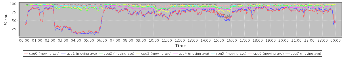 avg(cpu0) = 18.18 avg(cpu1) = 18.29 avg(cpu2) = 1.43 avg(cpu3) = 2.00 avg(cpu4) = 0.64 avg(cpu5) = 1.05 avg(cpu6) = 0.35 avg(cpu7) = 1.56