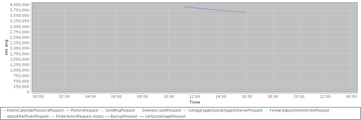 avg(DeleteCalendarResourceRequest) = 3646.67 avg(RestoreRequest) = 3761222.00 avg(SendMsgRequest) = 315.45 avg(DeleteAccountRequest) = 16961.00 avg(GetAggregateQuotaUsageOnServerRequest) = 1122.00 avg(ForwardAppointmentInviteRequest) = 560.00 avg(ApplyFilterRulesRequest) = 2685.00 avg(FolderActionRequest.empty) = 562.22 avg(BackupRequest) = 1427.50 avg(GetQuotaUsageRequest) = 1161.00