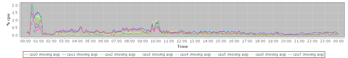 avg(cpu0) = 1.11 avg(cpu1) = 1.35 avg(cpu2) = 0.76 avg(cpu3) = 0.95 avg(cpu4) = 0.59 avg(cpu5) = 0.72 avg(cpu6) = 0.33 avg(cpu7) = 0.59