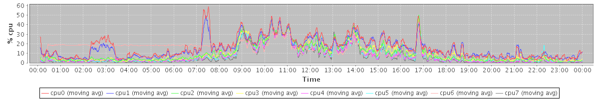 avg(cpu0) = 15.94 avg(cpu1) = 14.73 avg(cpu2) = 9.81 avg(cpu3) = 10.09 avg(cpu4) = 8.07 avg(cpu5) = 8.36 avg(cpu6) = 12.83 avg(cpu7) = 6.87