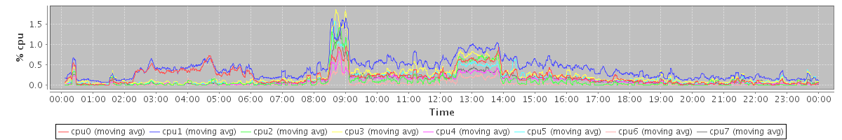 avg(cpu0) = 1.26 avg(cpu1) = 1.59 avg(cpu2) = 0.78 avg(cpu3) = 1.16 avg(cpu4) = 0.62 avg(cpu5) = 0.90 avg(cpu6) = 0.33 avg(cpu7) = 0.68