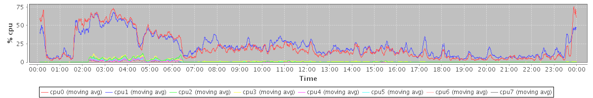 avg(cpu0) = 20.22 avg(cpu1) = 22.09 avg(cpu2) = 1.07 avg(cpu3) = 1.43 avg(cpu4) = 0.60 avg(cpu5) = 0.85 avg(cpu6) = 0.21 avg(cpu7) = 0.44
