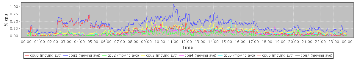 avg(cpu0) = 1.10 avg(cpu1) = 1.44 avg(cpu2) = 0.58 avg(cpu3) = 0.99 avg(cpu4) = 0.54 avg(cpu5) = 0.78 avg(cpu6) = 0.26 avg(cpu7) = 0.61