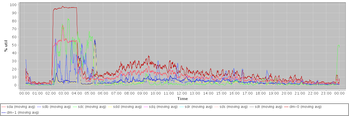 avg(sda) = 11.79 avg(sdb) = 7.19 avg(sdc) = 7.99 avg(sdd) = 3.03 avg(sdq) = 11.79 avg(sdr) = 7.17 avg(sds) = 7.99 avg(sdt) = 3.06 avg(dm-0) = 19.73 avg(dm-1) = 4.51