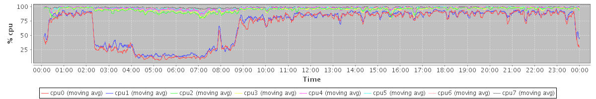avg(cpu0) = 19.65 avg(cpu1) = 17.88 avg(cpu2) = 1.18 avg(cpu3) = 1.03 avg(cpu4) = 0.51 avg(cpu5) = 0.42 avg(cpu6) = 0.26 avg(cpu7) = 0.21