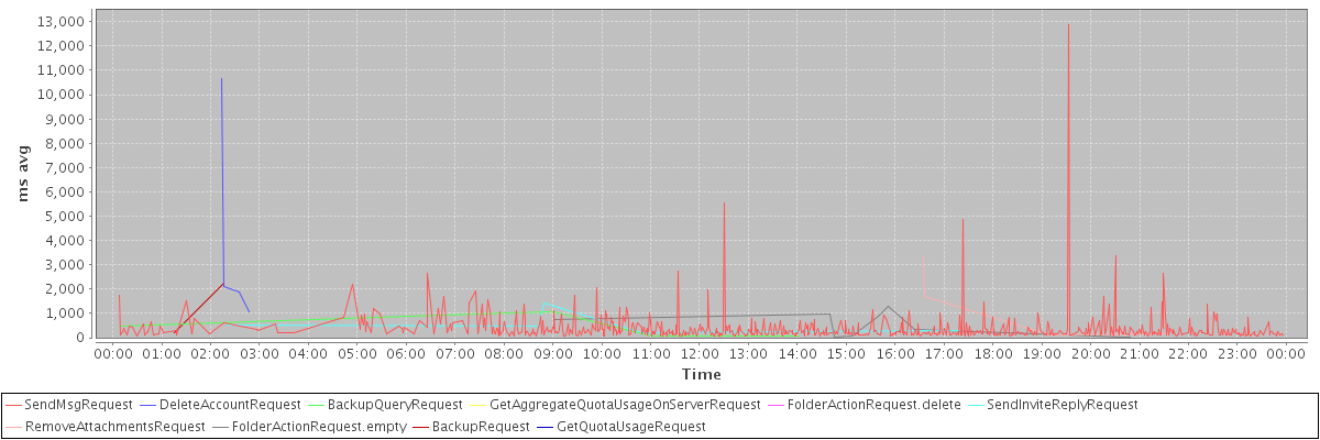 avg(SendMsgRequest) = 366.34 avg(DeleteAccountRequest) = 3913.25 avg(BackupQueryRequest) = 547.40 avg(GetAggregateQuotaUsageOnServerRequest) = 1565.00 avg(FolderActionRequest.delete) = 292.00 avg(SendInviteReplyRequest) = 528.33 avg(RemoveAttachmentsRequest) = 1327.75 avg(FolderActionRequest.empty) = 444.30 avg(BackupRequest) = 1221.50 avg(GetQuotaUsageRequest) = 1785.00