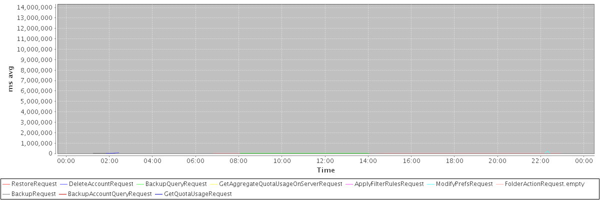 avg(RestoreRequest) = 13656425.00 avg(DeleteAccountRequest) = 15973.20 avg(BackupQueryRequest) = 619.71 avg(GetAggregateQuotaUsageOnServerRequest) = 1225.00 avg(ApplyFilterRulesRequest) = 2681.00 avg(ModifyPrefsRequest) = 698.95 avg(FolderActionRequest.empty) = 1040.21 avg(BackupRequest) = 1829.00 avg(BackupAccountQueryRequest) = 2173.33 avg(GetQuotaUsageRequest) = 1474.00