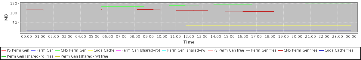 avg(PS Perm Gen) = 0.00 avg(Perm Gen) = 0.00 avg(CMS Perm Gen) = 141.58 avg(Code Cache) = 37.57 avg(Perm Gen [shared-ro]) = 0.00 avg(Perm Gen [shared-rw]) = 0.00 avg(PS Perm Gen free) = 0.00 avg(Perm Gen free) = 0.00 avg(CMS Perm Gen free) = 113.04 avg(Code Cache free) = 8.99 avg(Perm Gen [shared-ro] free) = 0.00 avg(Perm Gen [shared-rw] free) = 0.00