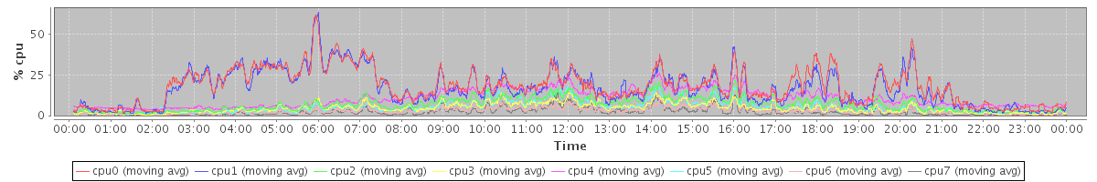 avg(cpu0) = 19.03 avg(cpu1) = 18.37 avg(cpu2) = 1.39 avg(cpu3) = 1.21 avg(cpu4) = 0.66 avg(cpu5) = 0.69 avg(cpu6) = 0.28 avg(cpu7) = 0.24