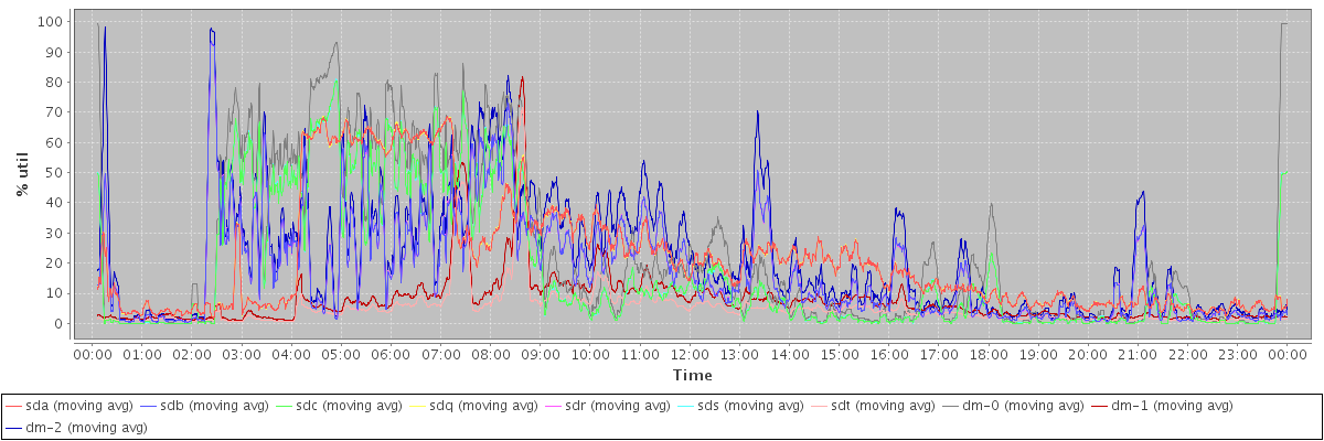 avg(sda) = 21.52 avg(sdb) = 17.27 avg(sdc) = 17.41 avg(sdq) = 21.54 avg(sdr) = 17.27 avg(sds) = 17.41 avg(sdt) = 5.16 avg(dm-0) = 23.28 avg(dm-1) = 7.57 avg(dm-2) = 21.79