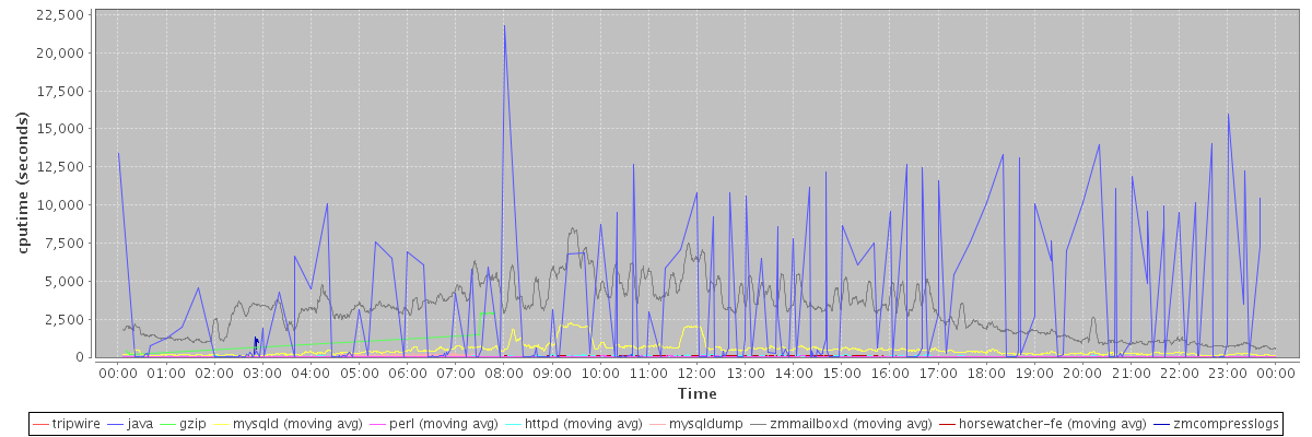 avg(tripwire) = 1980.00 avg(java) = 2353.65 avg(gzip) = 2284.64 avg(mysqld) = 473.96 avg(perl) = 38.34 avg(httpd) = 31.67 avg(mysqldump) = 139.77 avg(zmmailboxd) = 3054.33 avg(horsewatcher-fe) = 44.94 avg(zmcompresslogs) = 930.80