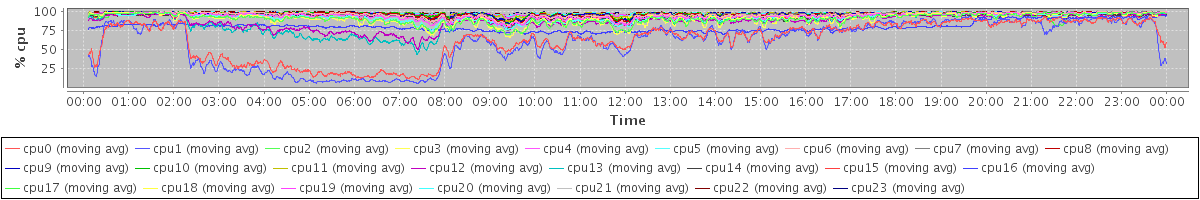 avg(cpu0) = 0.26 avg(cpu1) = 0.28 avg(cpu2) = 0.15 avg(cpu3) = 0.14 avg(cpu4) = 0.08 avg(cpu5) = 0.14 avg(cpu6) = 0.06 avg(cpu7) = 0.07 avg(cpu8) = 0.05 avg(cpu9) = 0.04 avg(cpu10) = 0.03 avg(cpu11) = 0.02 avg(cpu12) = 0.11 avg(cpu13) = 0.03 avg(cpu14) = 0.09 avg(cpu15) = 0.09 avg(cpu16) = 0.24 avg(cpu17) = 0.09 avg(cpu18) = 0.08 avg(cpu19) = 0.01 avg(cpu20) = 0.01 avg(cpu21) = 0.03 avg(cpu22) = 0.01 avg(cpu23) = 0.00