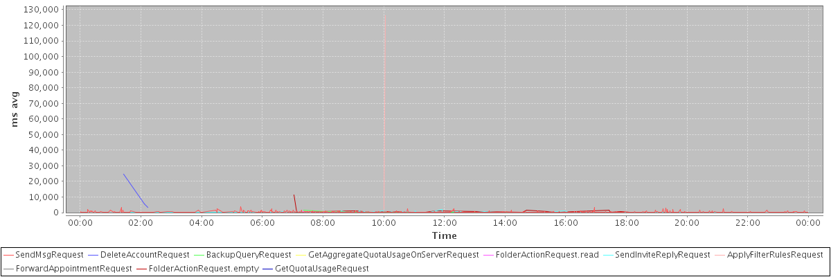 avg(SendMsgRequest) = 340.30 avg(DeleteAccountRequest) = 11057.33 avg(BackupQueryRequest) = 513.29 avg(GetAggregateQuotaUsageOnServerRequest) = 988.00 avg(FolderActionRequest.read) = 327.33 avg(SendInviteReplyRequest) = 341.60 avg(ApplyFilterRulesRequest) = 64363.00 avg(ForwardAppointmentRequest) = 874.00 avg(FolderActionRequest.empty) = 991.81 avg(GetQuotaUsageRequest) = 1141.00