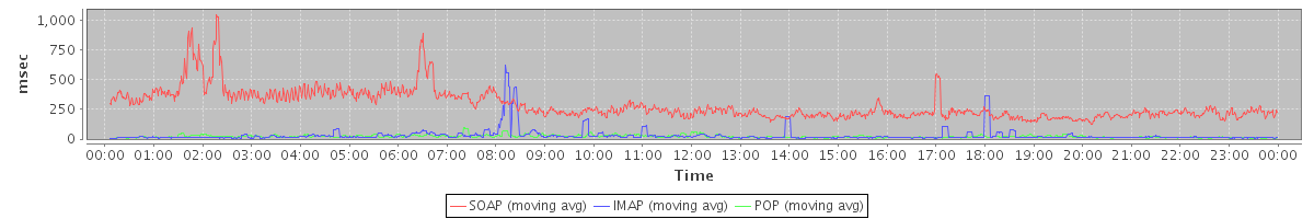 avg(ModifyAppointmentRequest) = 316.57 avg(SendMsgRequest) = 508.13 avg(MsgActionRequest.delete) = 276.64 avg(DeleteAccountRequest) = 6367.00 avg(BackupQueryRequest) = 555.17 avg(GetAggregateQuotaUsageOnServerRequest) = 1715.00 avg(BrowseRequest) = 492.00 avg(BounceMsgRequest) = 451.00 avg(FolderActionRequest.empty) = 1296.00 avg(GetQuotaUsageRequest) = 2372.00