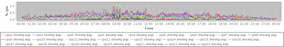 avg(cpu0) = 1.58 avg(cpu1) = 1.55 avg(cpu2) = 1.03 avg(cpu3) = 0.94 avg(cpu4) = 0.71 avg(cpu5) = 0.77 avg(cpu6) = 0.57 avg(cpu7) = 0.47 avg(cpu8) = 0.38 avg(cpu9) = 0.30 avg(cpu10) = 0.30 avg(cpu11) = 0.24 avg(cpu12) = 1.25 avg(cpu13) = 0.79 avg(cpu14) = 1.47 avg(cpu15) = 1.09 avg(cpu16) = 0.81 avg(cpu17) = 0.91 avg(cpu18) = 0.55 avg(cpu19) = 0.36 avg(cpu20) = 0.26 avg(cpu21) = 0.28 avg(cpu22) = 0.22 avg(cpu23) = 0.22