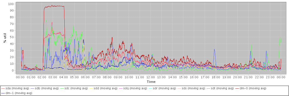 avg(sda) = 12.29 avg(sdb) = 8.61 avg(sdc) = 9.83 avg(sdd) = 3.99 avg(sdq) = 12.30 avg(sdr) = 8.60 avg(sds) = 9.82 avg(sdt) = 4.02 avg(dm-0) = 20.47 avg(dm-1) = 6.08