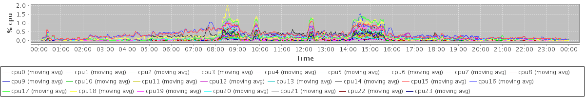 avg(cpu0) = 1.73 avg(cpu1) = 1.52 avg(cpu2) = 1.37 avg(cpu3) = 1.23 avg(cpu4) = 0.96 avg(cpu5) = 0.88 avg(cpu6) = 0.80 avg(cpu7) = 0.66 avg(cpu8) = 0.60 avg(cpu9) = 0.47 avg(cpu10) = 0.46 avg(cpu11) = 0.37 avg(cpu12) = 0.99 avg(cpu13) = 0.73 avg(cpu14) = 1.26 avg(cpu15) = 0.85 avg(cpu16) = 1.17 avg(cpu17) = 0.86 avg(cpu18) = 0.66 avg(cpu19) = 0.40 avg(cpu20) = 0.37 avg(cpu21) = 0.29 avg(cpu22) = 0.27 avg(cpu23) = 0.24