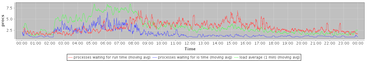 avg(processes waiting for run time) = 3.14 avg(processes waiting for io time) = 1.13 avg(load average (1 min)) = 3.48