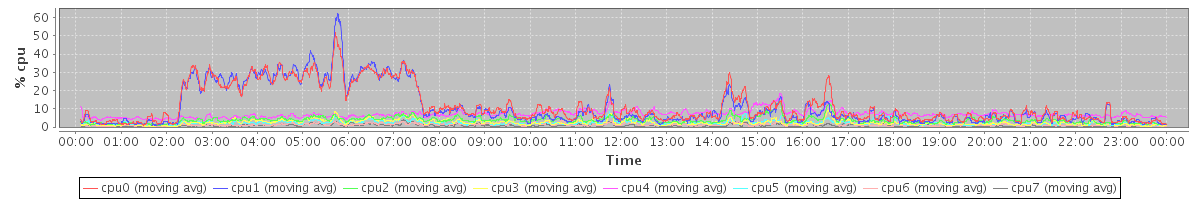 avg(cpu0) = 11.58 avg(cpu1) = 10.80 avg(cpu2) = 3.72 avg(cpu3) = 2.34 avg(cpu4) = 7.07 avg(cpu5) = 2.38 avg(cpu6) = 1.28 avg(cpu7) = 0.79