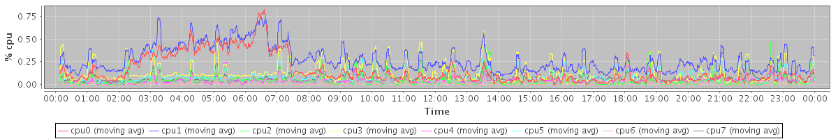 avg(cpu0) = 0.15 avg(cpu1) = 0.27 avg(cpu2) = 0.05 avg(cpu3) = 0.12 avg(cpu4) = 0.05 avg(cpu5) = 0.10 avg(cpu6) = 0.01 avg(cpu7) = 0.07