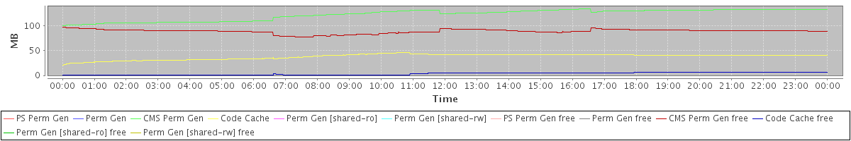avg(PS Perm Gen) = 0.00 avg(Perm Gen) = 0.00 avg(CMS Perm Gen) = 121.77 avg(Code Cache) = 37.98 avg(Perm Gen [shared-ro]) = 0.00 avg(Perm Gen [shared-rw]) = 0.00 avg(PS Perm Gen free) = 0.00 avg(Perm Gen free) = 0.00 avg(CMS Perm Gen free) = 88.37 avg(Code Cache free) = 3.16 avg(Perm Gen [shared-ro] free) = 0.00 avg(Perm Gen [shared-rw] free) = 0.00