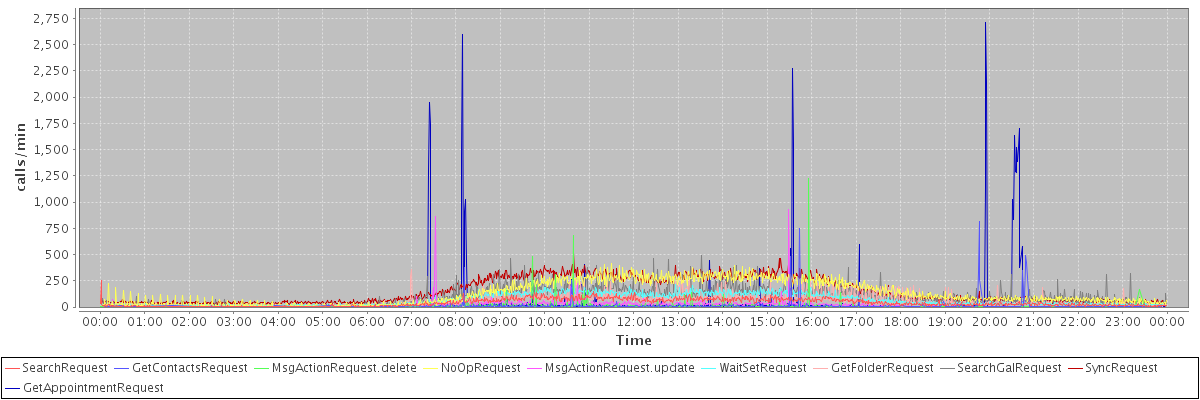 max(SearchRequest) = 253.00 max(GetContactsRequest) = 810.00 max(MsgActionRequest.delete) = 1228.00 max(NoOpRequest) = 416.00 max(MsgActionRequest.update) = 928.00 max(WaitSetRequest) = 240.00 max(GetFolderRequest) = 353.00 max(SearchGalRequest) = 486.00 max(SyncRequest) = 518.00 max(GetAppointmentRequest) = 2713.00