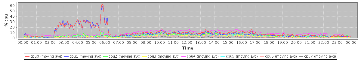 avg(cpu0) = 18.64 avg(cpu1) = 17.84 avg(cpu2) = 1.11 avg(cpu3) = 0.84 avg(cpu4) = 0.50 avg(cpu5) = 0.50 avg(cpu6) = 0.18 avg(cpu7) = 0.20