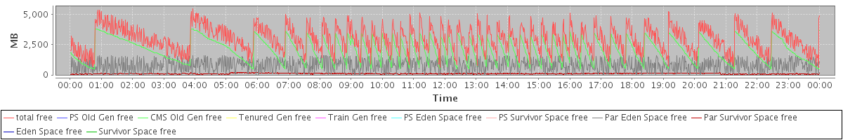 avg(total free) = 2972.94 avg(PS Old Gen free) = 0.00 avg(CMS Old Gen free) = 2051.42 avg(Tenured Gen free) = 0.00 avg(Train Gen free) = 0.00 avg(PS Eden Space free) = 0.00 avg(PS Survivor Space free) = 0.00 avg(Par Eden Space free) = 817.92 avg(Par Survivor Space free) = 103.60 avg(Eden Space free) = 0.00 avg(Survivor Space free) = 0.00