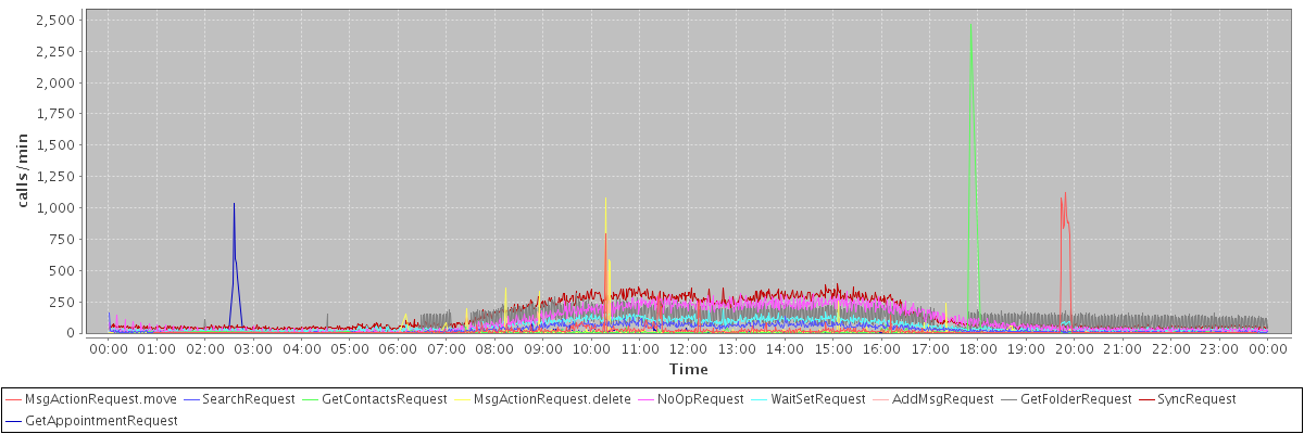 max(MsgActionRequest.move) = 1120.00 max(SearchRequest) = 162.00 max(GetContactsRequest) = 2467.00 max(MsgActionRequest.delete) = 1081.00 max(NoOpRequest) = 337.00 max(WaitSetRequest) = 189.00 max(AddMsgRequest) = 491.00 max(GetFolderRequest) = 312.00 max(SyncRequest) = 395.00 max(GetAppointmentRequest) = 1037.00