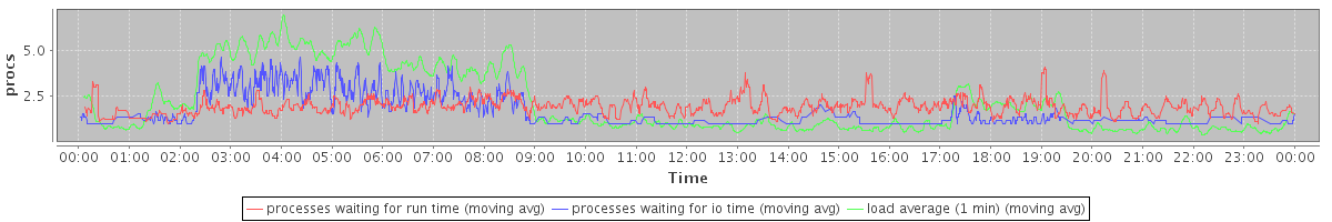 avg(processes waiting for run time) = 1.39 avg(processes waiting for io time) = 0.98 avg(load average (1 min)) = 2.11