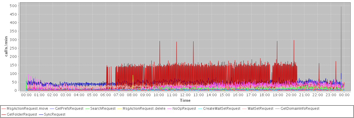 max(MsgActionRequest.move) = 59.00 max(GetPrefsRequest) = 54.00 max(SearchRequest) = 82.00 max(MsgActionRequest.delete) = 91.00 max(NoOpRequest) = 97.00 max(CreateWaitSetRequest) = 61.00 max(WaitSetRequest) = 65.00 max(GetDomainInfoRequest) = 495.00 max(GetFolderRequest) = 296.00 max(SyncRequest) = 101.00