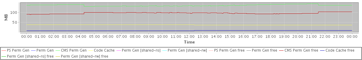 avg(PS Perm Gen) = 0.00 avg(Perm Gen) = 0.00 avg(CMS Perm Gen) = 135.08 avg(Code Cache) = 37.61 avg(Perm Gen [shared-ro]) = 0.00 avg(Perm Gen [shared-rw]) = 0.00 avg(PS Perm Gen free) = 0.00 avg(Perm Gen free) = 0.00 avg(CMS Perm Gen free) = 96.27 avg(Code Cache free) = 9.01 avg(Perm Gen [shared-ro] free) = 0.00 avg(Perm Gen [shared-rw] free) = 0.00