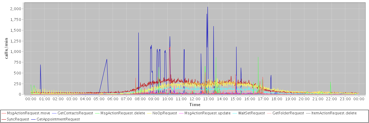 max(MsgActionRequest.move) = 1117.00 max(GetContactsRequest) = 426.00 max(MsgActionRequest.delete) = 876.00 max(NoOpRequest) = 373.00 max(MsgActionRequest.update) = 209.00 max(WaitSetRequest) = 231.00 max(GetFolderRequest) = 247.00 max(ItemActionRequest.delete) = 234.00 max(SyncRequest) = 464.00 max(GetAppointmentRequest) = 2048.00