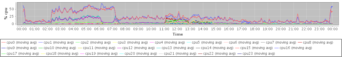 avg(cpu0) = 21.53 avg(cpu1) = 21.80 avg(cpu2) = 1.79 avg(cpu3) = 1.74 avg(cpu4) = 0.95 avg(cpu5) = 0.82 avg(cpu6) = 0.69 avg(cpu7) = 0.80 avg(cpu8) = 1.35 avg(cpu9) = 0.60 avg(cpu10) = 0.71 avg(cpu11) = 0.46 avg(cpu12) = 4.77 avg(cpu13) = 4.99 avg(cpu14) = 0.39 avg(cpu15) = 0.42 avg(cpu16) = 0.37 avg(cpu17) = 0.38 avg(cpu18) = 0.24 avg(cpu19) = 0.44 avg(cpu20) = 0.18 avg(cpu21) = 0.19 avg(cpu22) = 0.16 avg(cpu23) = 0.10