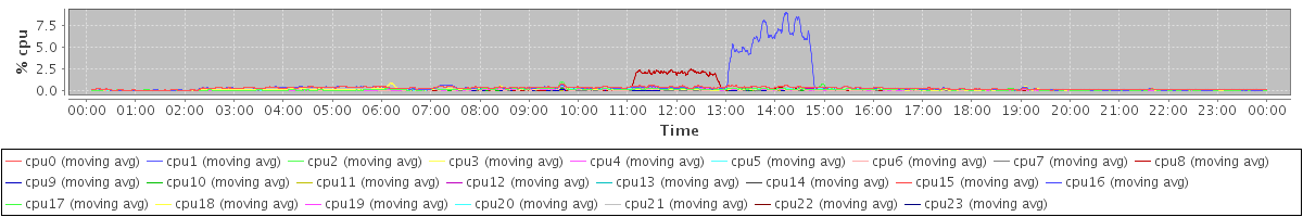 avg(cpu0) = 0.26 avg(cpu1) = 0.66 avg(cpu2) = 0.10 avg(cpu3) = 0.11 avg(cpu4) = 0.07 avg(cpu5) = 0.11 avg(cpu6) = 0.04 avg(cpu7) = 0.03 avg(cpu8) = 0.18 avg(cpu9) = 0.01 avg(cpu10) = 0.01 avg(cpu11) = 0.01 avg(cpu12) = 0.11 avg(cpu13) = 0.02 avg(cpu14) = 0.08 avg(cpu15) = 0.09 avg(cpu16) = 0.09 avg(cpu17) = 0.09 avg(cpu18) = 0.07 avg(cpu19) = 0.00 avg(cpu20) = 0.00 avg(cpu21) = 0.00 avg(cpu22) = 0.00 avg(cpu23) = 0.00
