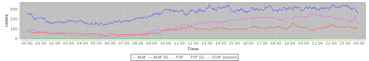 avg(IMAP) = 84.70 avg(IMAP SSL) = 254.38 avg(POP) = 0.06 avg(POP SSL) = 0.11 avg(SOAP sessions) = 129.58