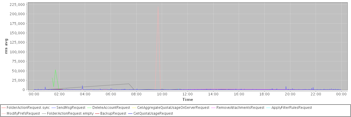 avg(FolderActionRequest.sync) = 6902.00 avg(SendMsgRequest) = 413.28 avg(DeleteAccountRequest) = 19670.20 avg(GetAggregateQuotaUsageOnServerRequest) = 1195.00 avg(RemoveAttachmentsRequest) = 502.62 avg(ApplyFilterRulesRequest) = 752.29 avg(ModifyPrefsRequest) = 929.59 avg(FolderActionRequest.empty) = 1070.40 avg(BackupRequest) = 806.50 avg(GetQuotaUsageRequest) = 1394.00