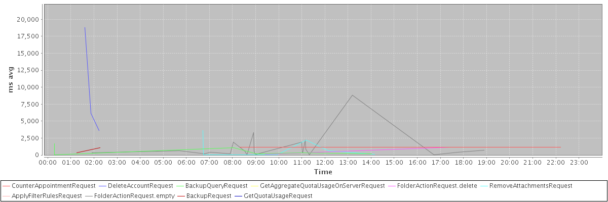 avg(CounterAppointmentRequest) = 1175.00 avg(DeleteAccountRequest) = 9505.00 avg(BackupQueryRequest) = 584.17 avg(GetAggregateQuotaUsageOnServerRequest) = 1307.00 avg(FolderActionRequest.delete) = 614.00 avg(RemoveAttachmentsRequest) = 1111.33 avg(ApplyFilterRulesRequest) = 21194.00 avg(FolderActionRequest.empty) = 1060.74 avg(BackupRequest) = 729.50 avg(GetQuotaUsageRequest) = 1538.00
