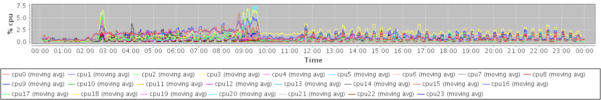 avg(cpu0) = 0.15 avg(cpu1) = 0.26 avg(cpu2) = 0.05 avg(cpu3) = 0.22 avg(cpu4) = 0.05 avg(cpu5) = 0.09 avg(cpu6) = 0.03 avg(cpu7) = 0.07 avg(cpu8) = 0.01 avg(cpu9) = 0.03 avg(cpu10) = 0.00 avg(cpu11) = 0.01 avg(cpu12) = 0.01 avg(cpu13) = 0.03 avg(cpu14) = 0.00 avg(cpu15) = 0.01 avg(cpu16) = 0.00 avg(cpu17) = 0.03 avg(cpu18) = 0.00 avg(cpu19) = 0.01 avg(cpu20) = 0.00 avg(cpu21) = 0.02 avg(cpu22) = 0.00 avg(cpu23) = 0.03