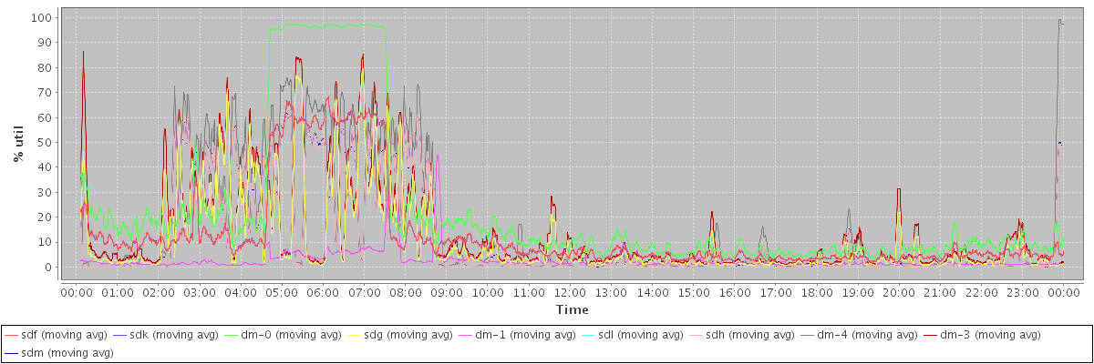 avg(sdf) = 13.31 avg(sdk) = 13.30 avg(dm-0) = 22.14 avg(sdg) = 10.64 avg(dm-1) = 2.70 avg(sdl) = 10.64 avg(sdh) = 11.52 avg(dm-4) = 14.84 avg(dm-3) = 12.92 avg(sdm) = 11.52