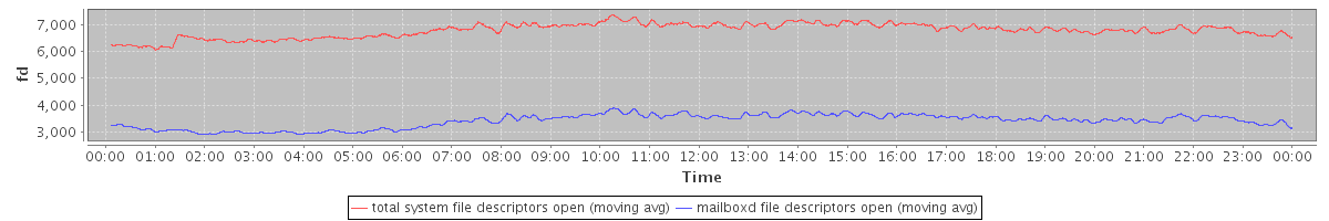 avg(total system file descriptors open) = 6779.58 avg(mailboxd file descriptors open) = 3403.36