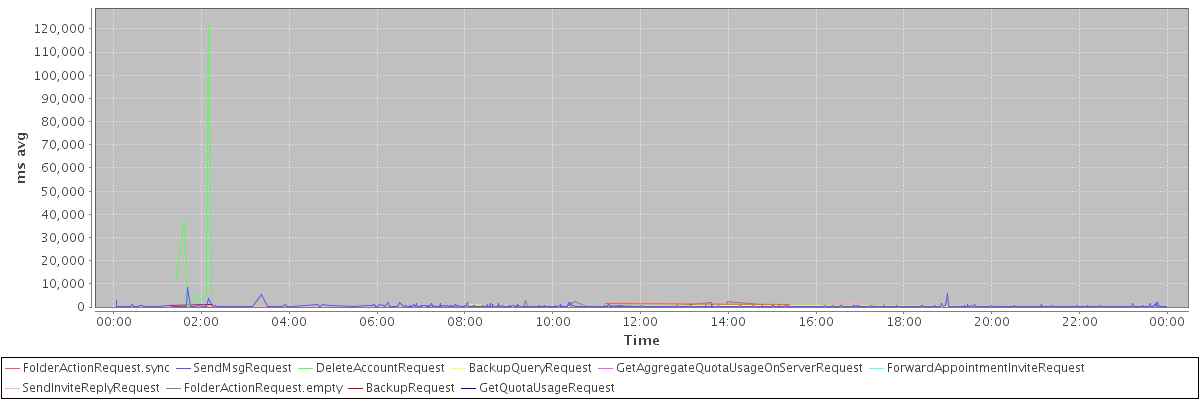 avg(FolderActionRequest.sync) = 1314.50 avg(SendMsgRequest) = 290.31 avg(DeleteAccountRequest) = 19397.40 avg(BackupQueryRequest) = 426.83 avg(GetAggregateQuotaUsageOnServerRequest) = 1070.00 avg(ForwardAppointmentInviteRequest) = 242.00 avg(SendInviteReplyRequest) = 284.82 avg(FolderActionRequest.empty) = 535.53 avg(BackupRequest) = 863.00 avg(GetQuotaUsageRequest) = 1141.00